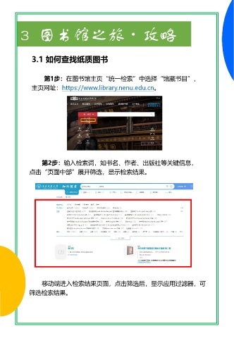 3 图书馆之旅·攻略 3.1 如何查找纸质图书 第1步:在图书馆主页“统一检索”中选择“馆藏书目”, 主页网址:https://www.library.nenu.edu.cn。 第2步:输入检索词,如书名、作者、出版社等关键信息, 点击“页面中部”展开筛选,显示检索结果。 移动端进入检索结果页面,点击筛选后,显示应用过滤器,可 筛选检索结果。