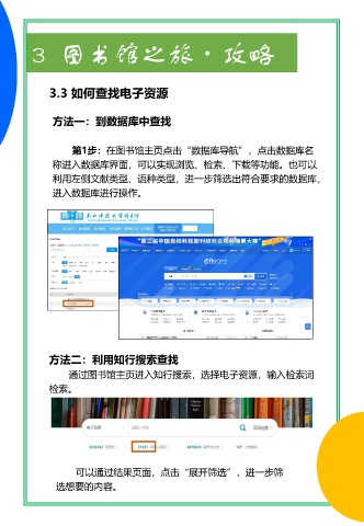 3 图书馆之旅·攻略 3.3 如何查找电子资源 方法一:到数据库中查找 第1步:在图书馆主页点击“数据库导航”,点击数据库名 称进入数据库界面,可以实现浏览、检索、下载等功能。也可以 利用左侧文献类型、语种类型,进一步筛选出符合要求的数据库, 进入数据库进行操作。 方法二:利用知行搜索查找 通过图书馆主页进入知行搜索,选择电子资源,输入检索词 检索。 可以通过结果页面,点击“展开筛选”,进一步筛 选想要的内容。