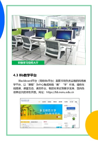 积极学习空间大厅 4.3 Bb教学平台 Blackboard平台(简称Bb平台)是图书馆负责运维的网络教 学平台,以“课程”为中心集成网络“教”“学”环境,提供在 线授课、课堂互动、课后作业、物质化考试等教学支持,面向各 培养层次的师生开放。网址:https://bb.nenu.edu.cn