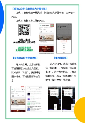 【微信公众号-东北师范大学图书馆】 方式1:在微信搜一搜找到“东北师范大学图书馆”公众号并 关注。 方式2:扫描下方二维码关注。 扫描二维码 关注图书馆微信公众号 建议设为星标 及时获取最新资讯 【在微信公众号查找消息】 【使用菜单栏】 进入公众号,上方检索栏 进入公众号,点击下方菜单 可进行标题与推送全文搜索。 栏“我的圕”,可登录“我的图 比如搜索“讲座”,按照时间 书馆”,进行费用结算,了解开 顺序排序,可找到最新讲座信 馆时间等,点击“资源动态”可 息。 使用“知行搜索”等功能。
