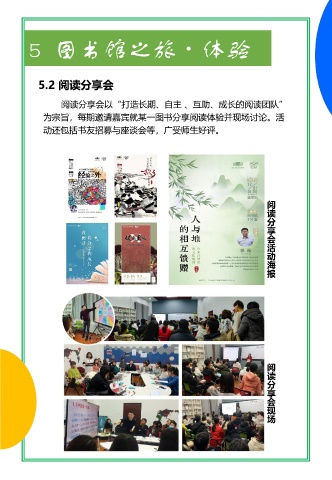 5 图书馆之旅·体验 5.2 阅读分享会 阅读分享会以“打造长期、自主 、互助、成长的阅读团队” 为宗旨,每期邀请嘉宾就某一图书分享阅读体验并现场讨论。活 动还包括书友招募与座谈会等,广受师生好评。 阅 读 分 享 会 活 动 海 报 阅 读 分 享 会 现 场