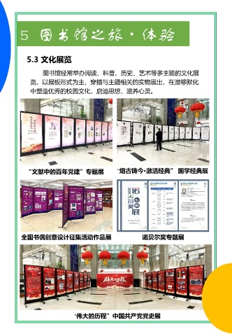 5 图书馆之旅·体验 5.3 文化展览 图书馆经常举办阅读、科普、历史、艺术等多主题的文化展 览,以展板形式为主,穿插与主题相关的实物展出,在潜移默化 中塑造优秀的校园文化,启迪思想,滋养心灵。 “文献中的百年党建”专题展 “熔古铸今·激活经典” 国学经典展 全国书偶创意设计征集活动作品展 诺贝尔奖专题展 “伟大的历程”中国共产党党史展